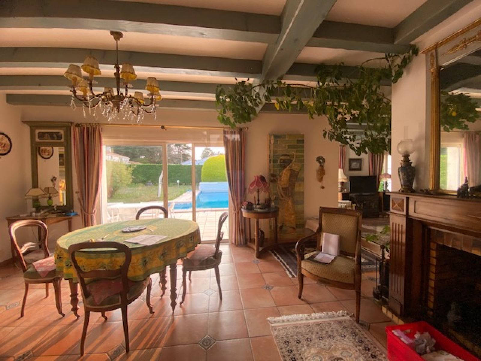 Jolie maison composée de: RDC: séjour (cheminée) salon, cuisine aménagée, arrière cuisine, 1 chambre avec salle d'eau, wc avec lave mains, garage. Etage: 2 chambres, salle de bains avec douche ,wc, dressing, sur un terrain de 1000 m2 avec piiscine (pompe à chaleur) et local technique.